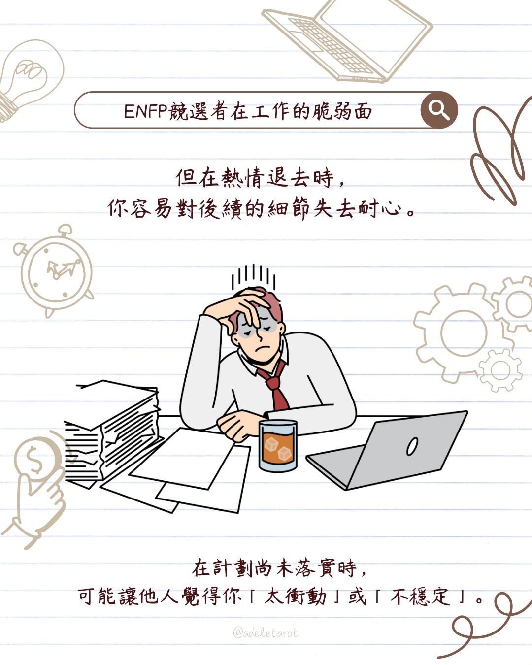 然而,當熱情逐漸退去時,ENFP 容易感到倦怠或分心。你可能在專案初期全力衝刺,但當細節變得繁瑣、進度顯得冗長時,耐心就會被消磨。旁人因此誤解你「三分鐘熱度」或「缺乏穩定性」,甚至懷疑你是否能把事情完成。其實,這不是能力的不足,而是能量本質來自新鮮感,缺乏刺激時自然容易失焦。
