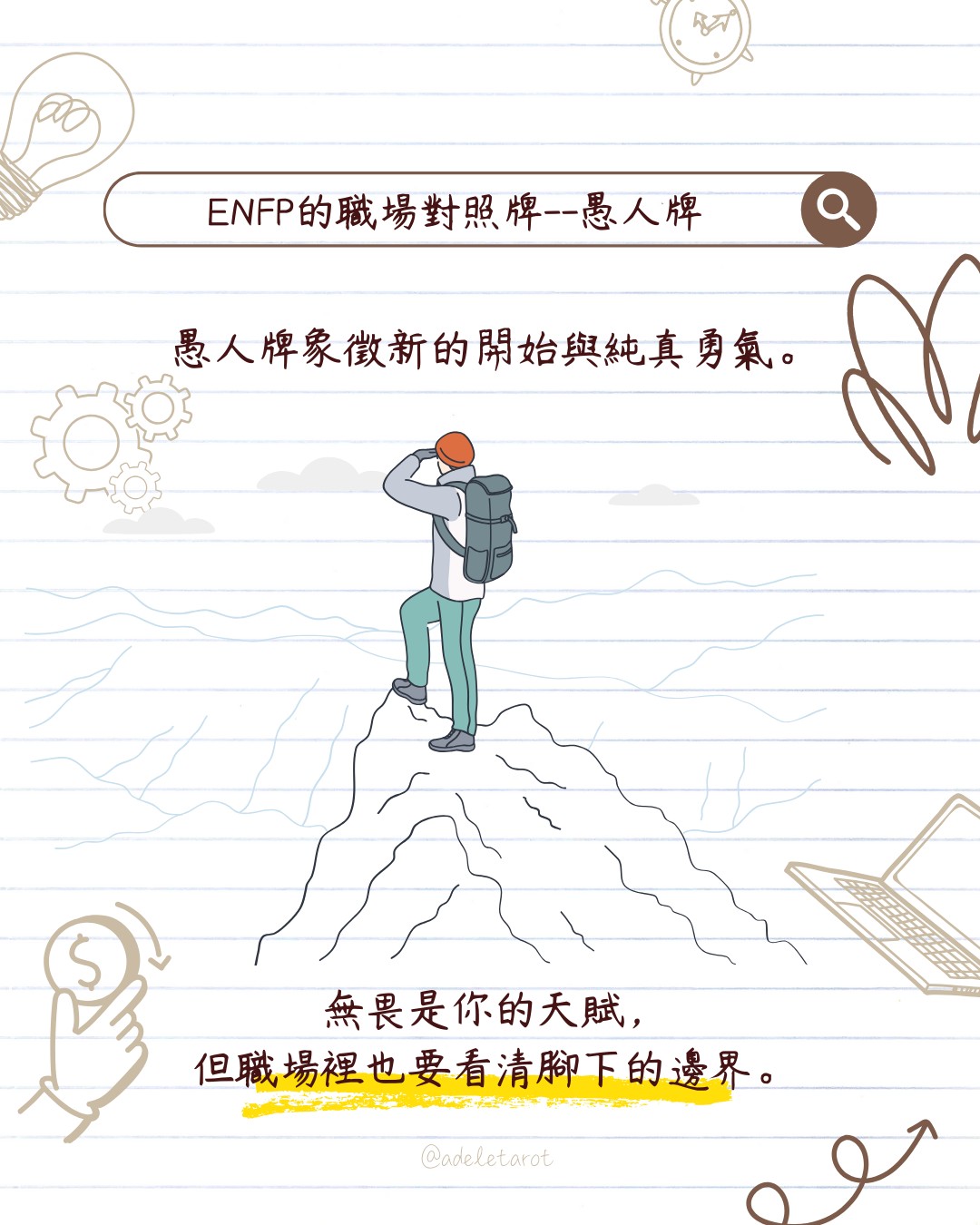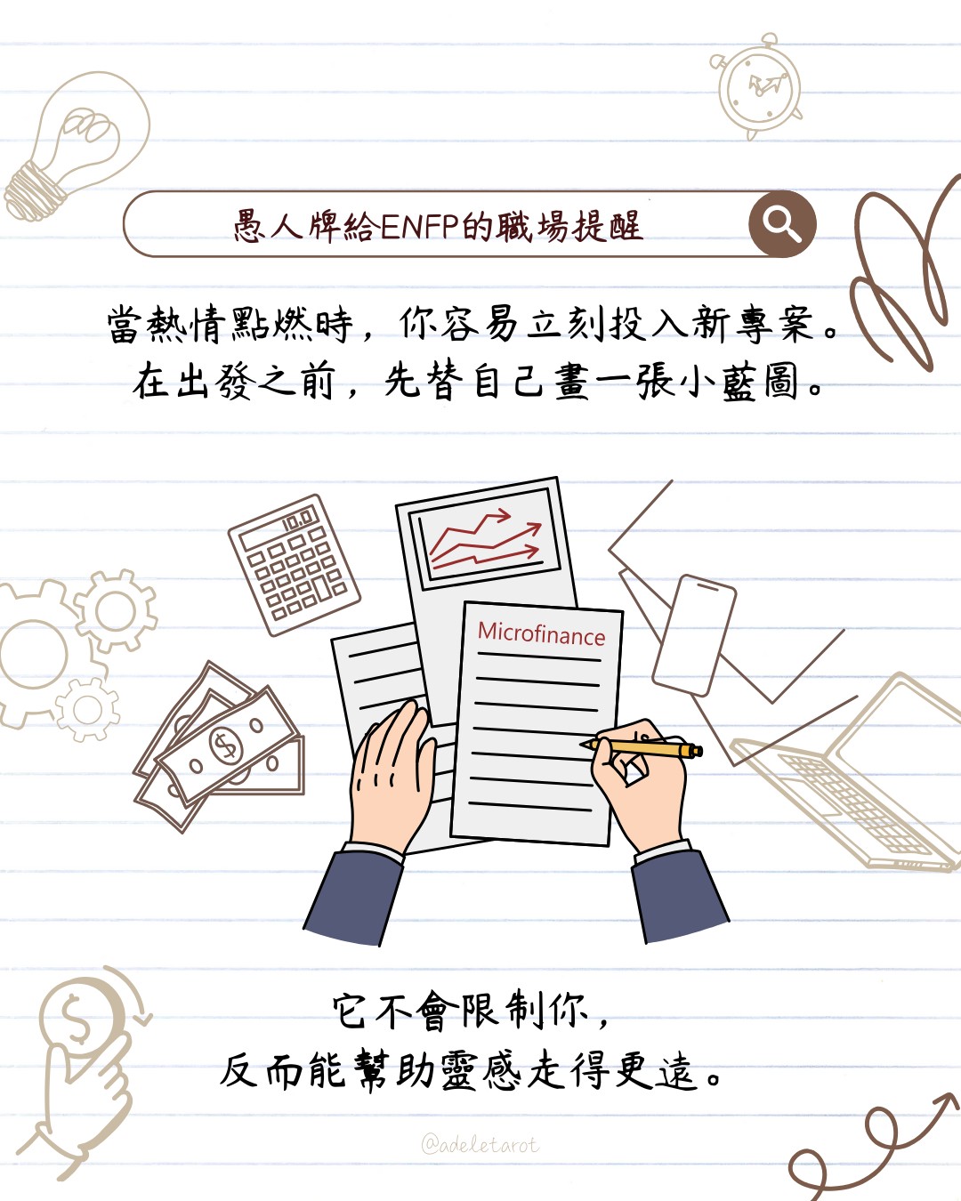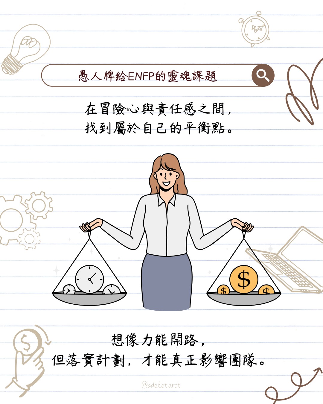 對 ENFP 而言,職場就像是一場冒險。你們樂於在新的專案或計畫中揮灑創意,即使沒有完整藍圖,也敢先邁出第一步。這種「邊走邊看」的精神,正是愚人牌最獨特的能量。外人或許覺得你天真、衝動,卻忽略了這份無畏才是推動團隊突破困境的力量。