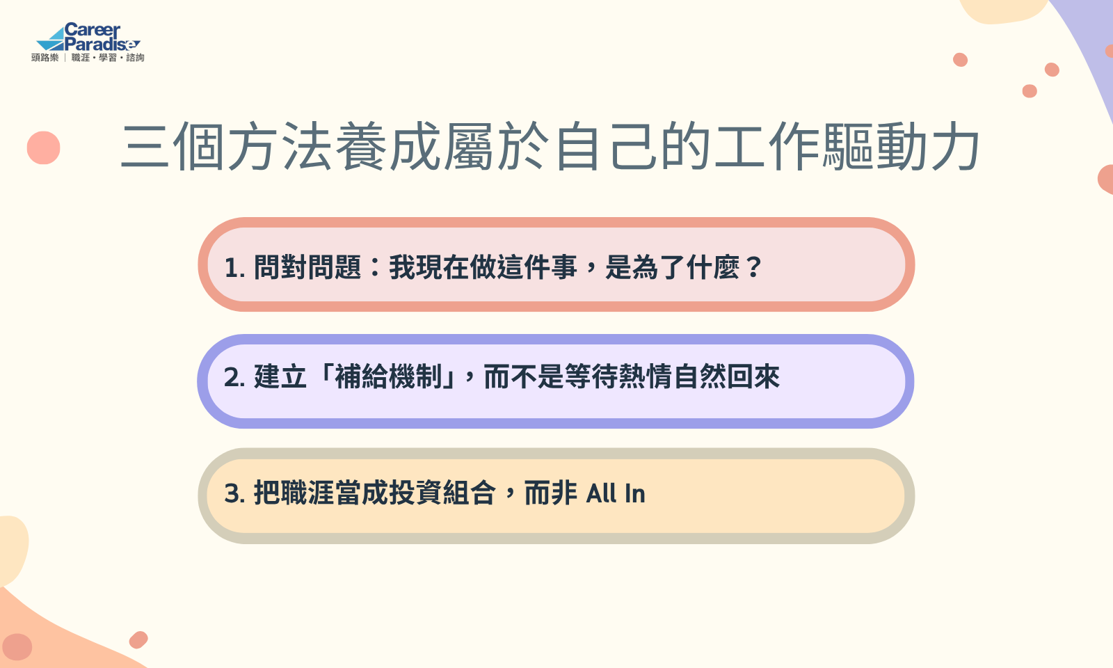 我自己也曾單押在外在驅動上—想升主管、想加薪、想證明自己—結果遇到瓶頸時,所有熱情瞬間瓦解,下意識就想換個環境,導致每份工作都做不久。而讓我開始反思這件事情,是當我開始留意內在驅動:即使公司沒有要求,或公司沒有機會,也要嘗試每天讓自己進步一點、看到努力的意義、找到有興趣的方向,才發現即使現實沒有立刻給我回報,也能讓我持續有工作的動力,不易感到疲憊也不易放棄。也許真正讓職涯穩定的是內外驅動兩者結合,而且能隨時間和需求彈性調整兩種驅動的比例。