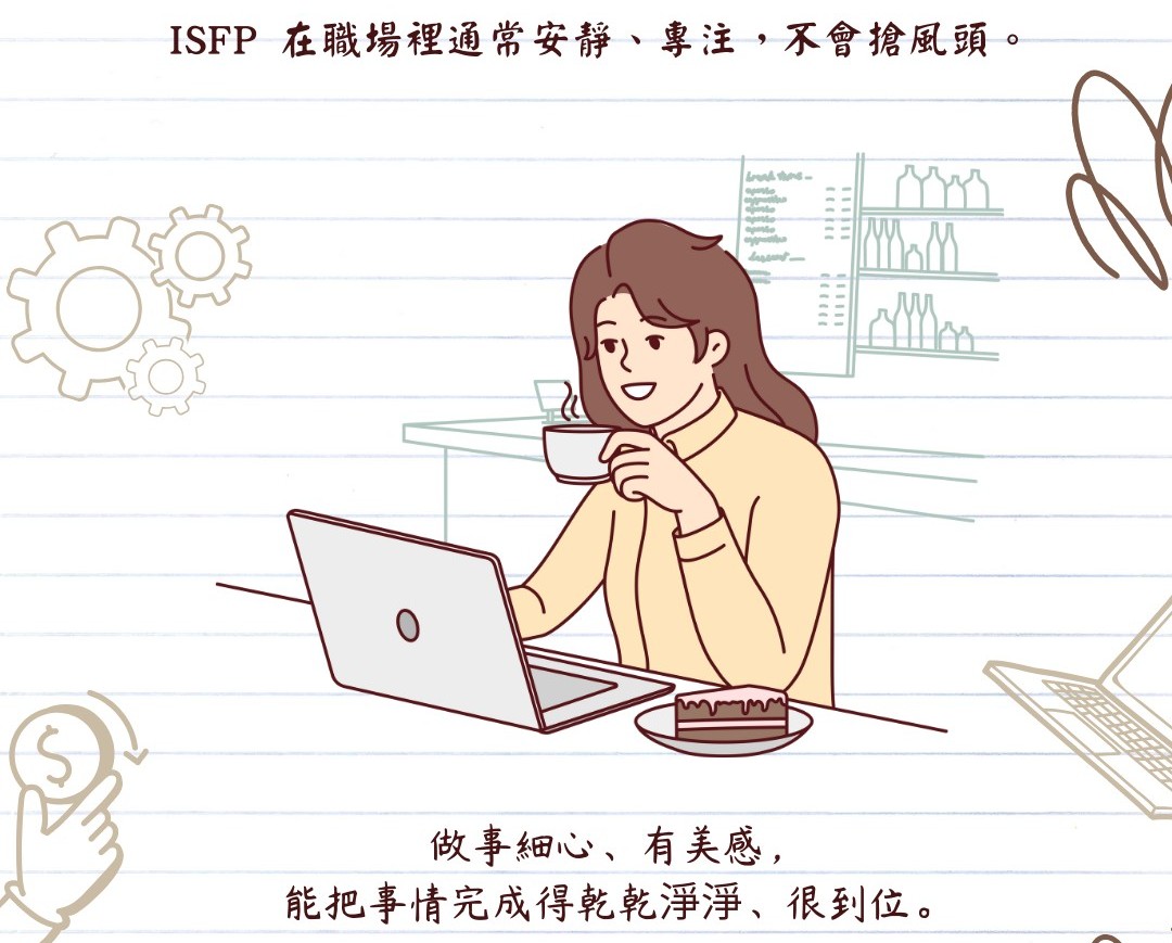 ISFP 在工作時常給人一種不吵、不搶、不爭的感覺。他們偏好用自己的方式完成任務,並把細節做到剛剛好。當大家還在討論辦法時,他們已經靜靜地開始做事,用踏實的方式讓專案往前走。