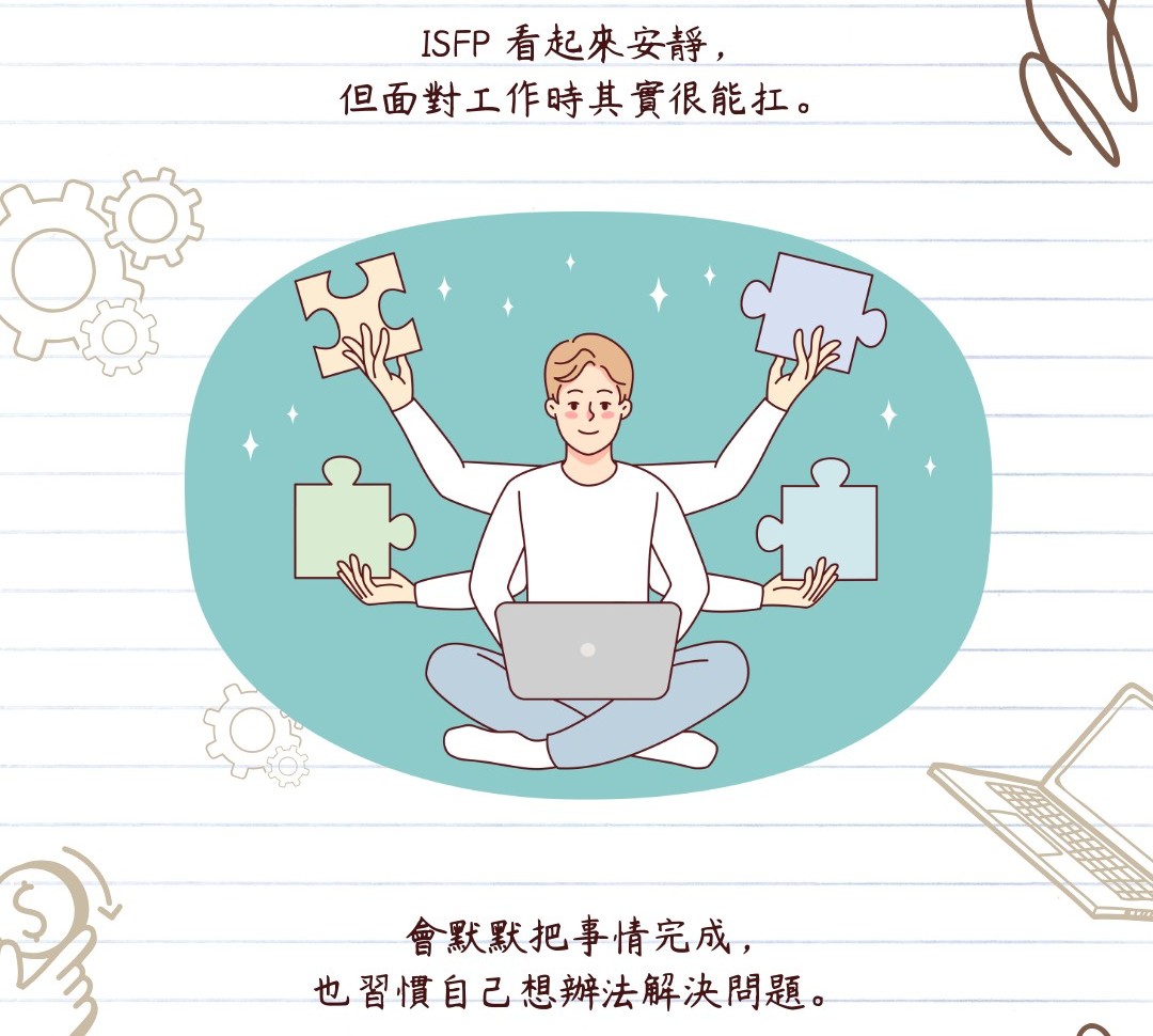 雖然 ISFP 給人的第一印象常是溫柔、內斂,但他們在工作中的承擔力其實很強。他們習慣自己面對問題,也會努力先找出方法再開口求助。面對壓力時,他們不會慌亂,而是從容地將情緒調整到能處理事情的狀態。