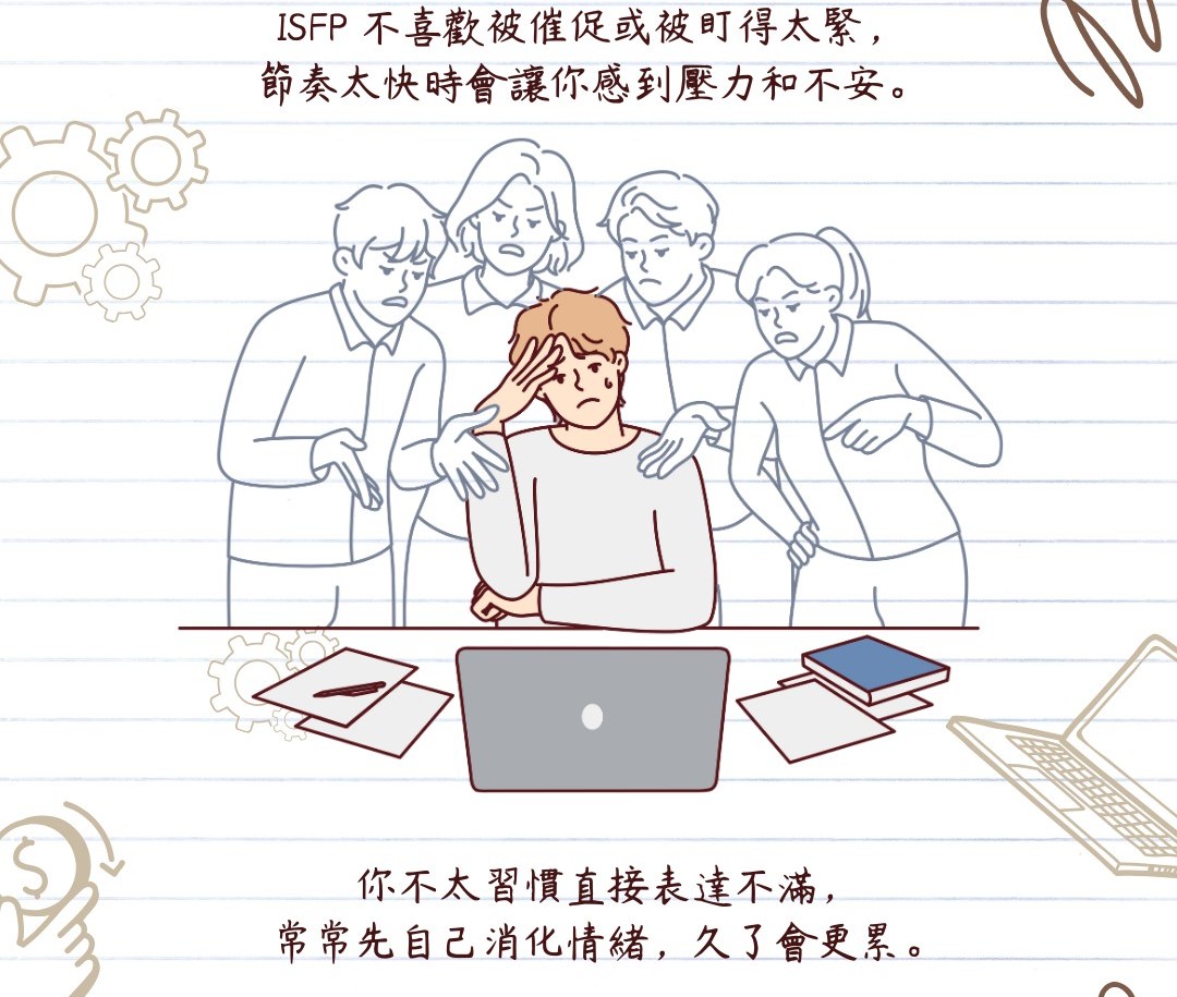 ISFP 不適合一直被催促或逼得太急。當進度、會議或主管的節奏變得過快時,他們會明顯感到壓力,甚至開始懷疑自己的能力。他們需要的是一個能專注的空間,而不是被盯著趕進度。