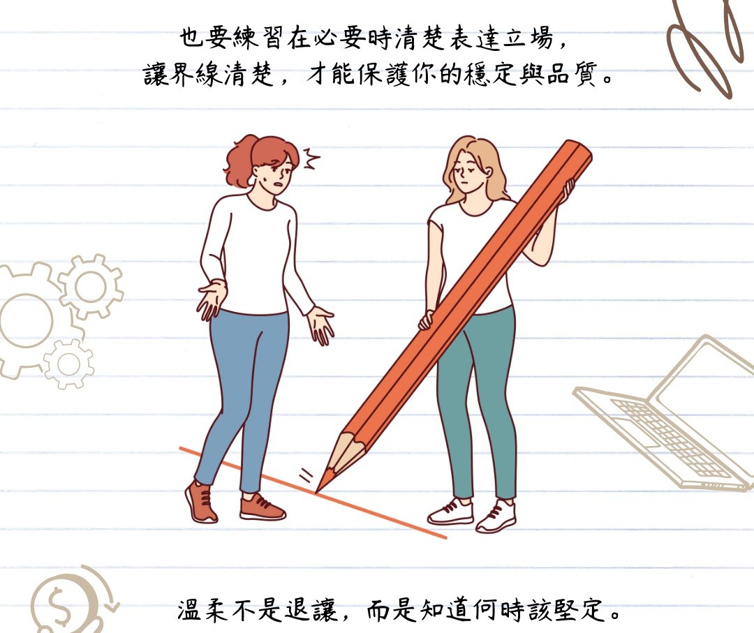 如果總是默默承擔壓力,或總是把不舒服留在心裡,外界會誤以為你沒意見,也會誤以為你能承受更多。清楚表達界線,並不會破壞和諧,反而能為你的穩定留出空間。