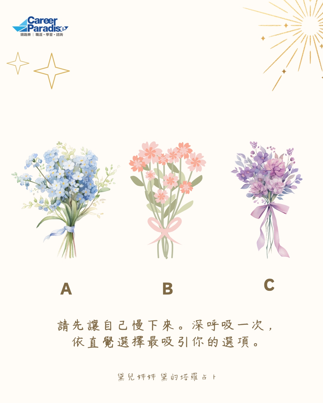 在這次的大眾占卜中,我們將透過三個不同的選項,來看看 2026 年整體運勢、工作、感情與健康所呈現的能量狀態。請先讓自己停下來一下。深呼吸一次,感受此刻的身體與情緒,然後依直覺選擇最吸引你的選項。