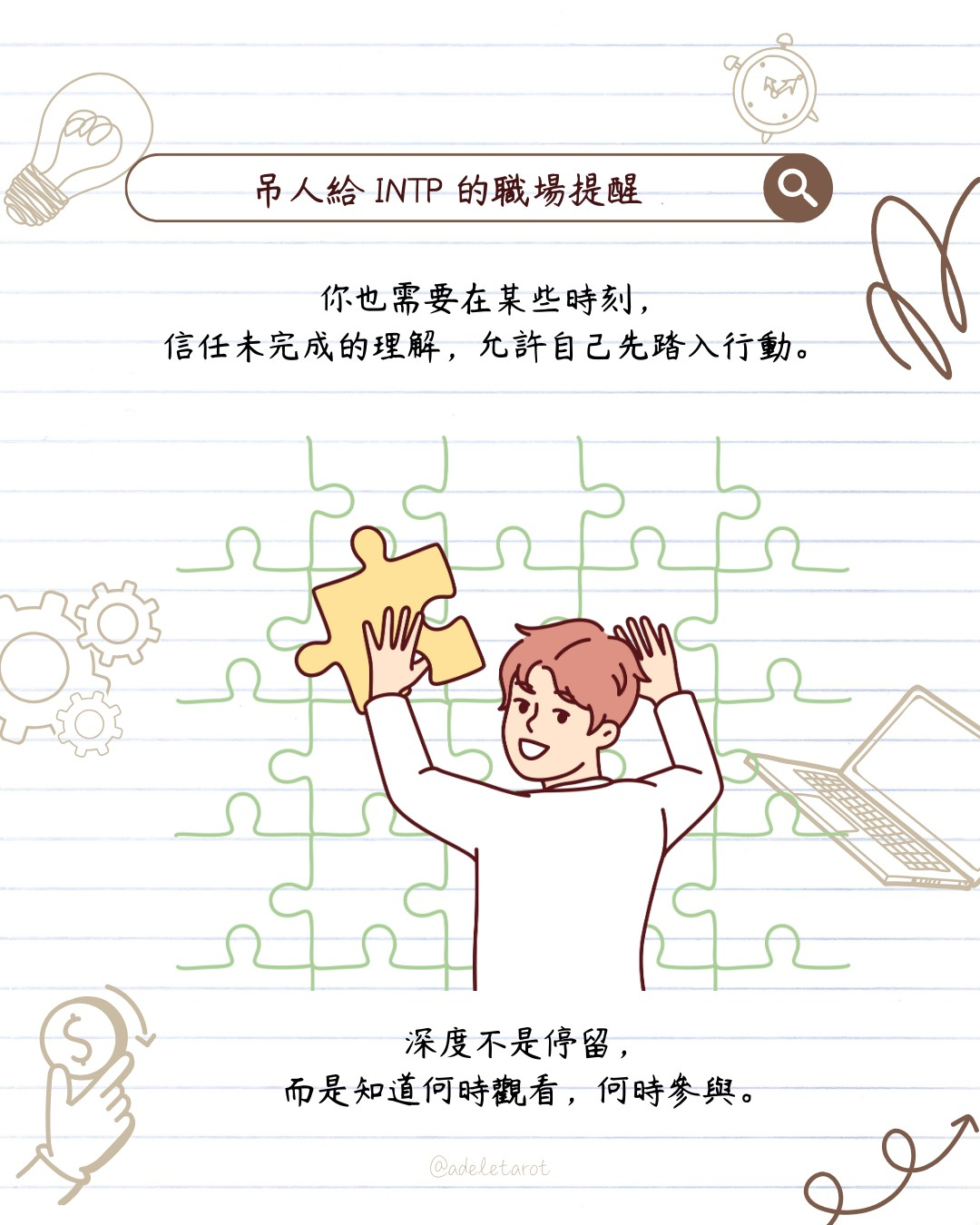 想閱讀更多 MBTI × 職場靈魂牌對照解析,或透過塔羅理解自己的職場節奏,歡迎追蹤我的 IG:@adeletarot。你也可以預約一場專屬塔羅指引,在理解與行動之間找到屬於自己的方向。