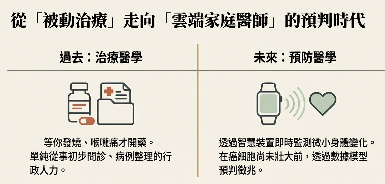 「我們正在從『治療醫學』走向『預防醫學』。」Alex 敘述未來的生活樣貌,他說:「未來的醫生可能不再是等你發燒、喉嚨痛才開藥,而是透過你手腕上的智慧裝置,即時監測心跳、脈搏與微小的身體變化。AI 能夠在癌症細胞尚未壯大前,就透過數據模型預判出徵兆。」這意味著,未來每個人的家裡都會有一個「雲端家庭醫師」,而那些單純從事初步問診、病例整理的行政與輔助人力,將面臨前所未有的生存壓力,因為在數據面前,人的眼力與記憶力,相形之下就顯得既慢且貴。