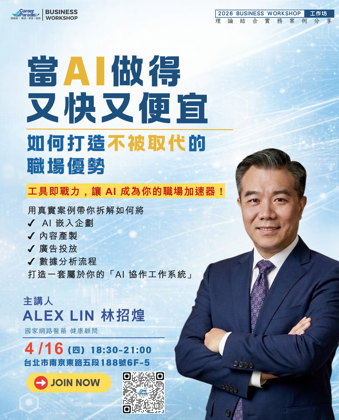 4/16,讓我們一起來聽 Alex 如何解構這場 AI 革命,找回你在職場中「無可取代」的價值。