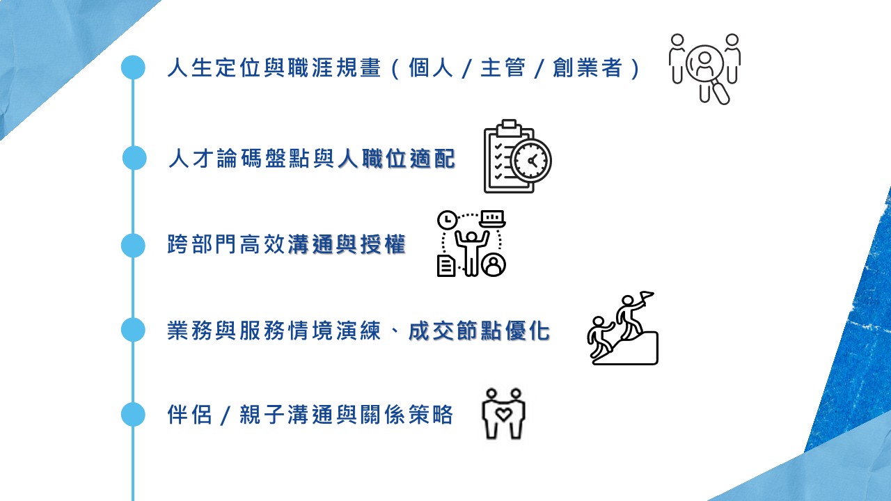 - 協助企業做人才盤點與組織調整,建立主管對上、平行、對下三層匯報與授權節奏