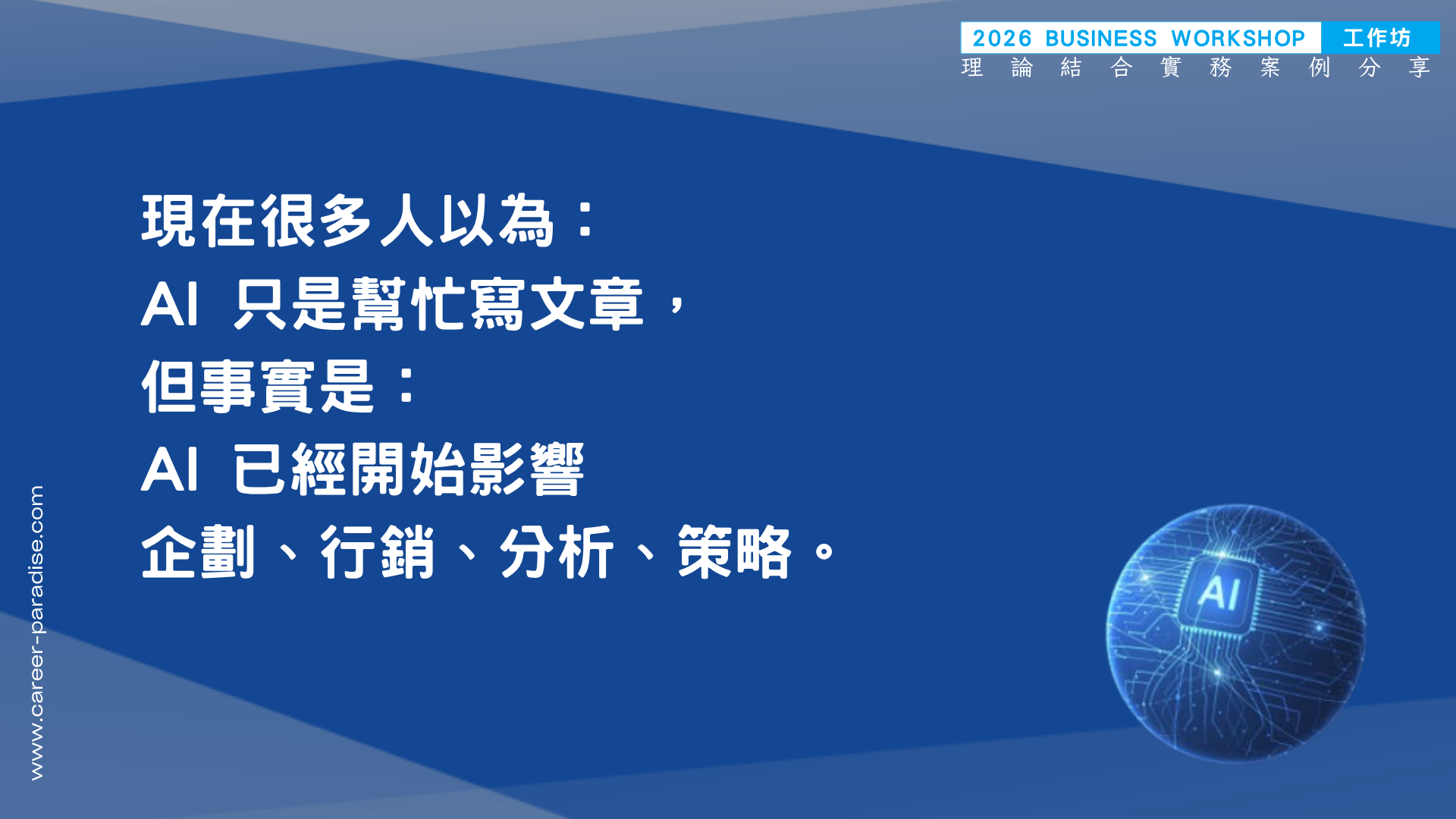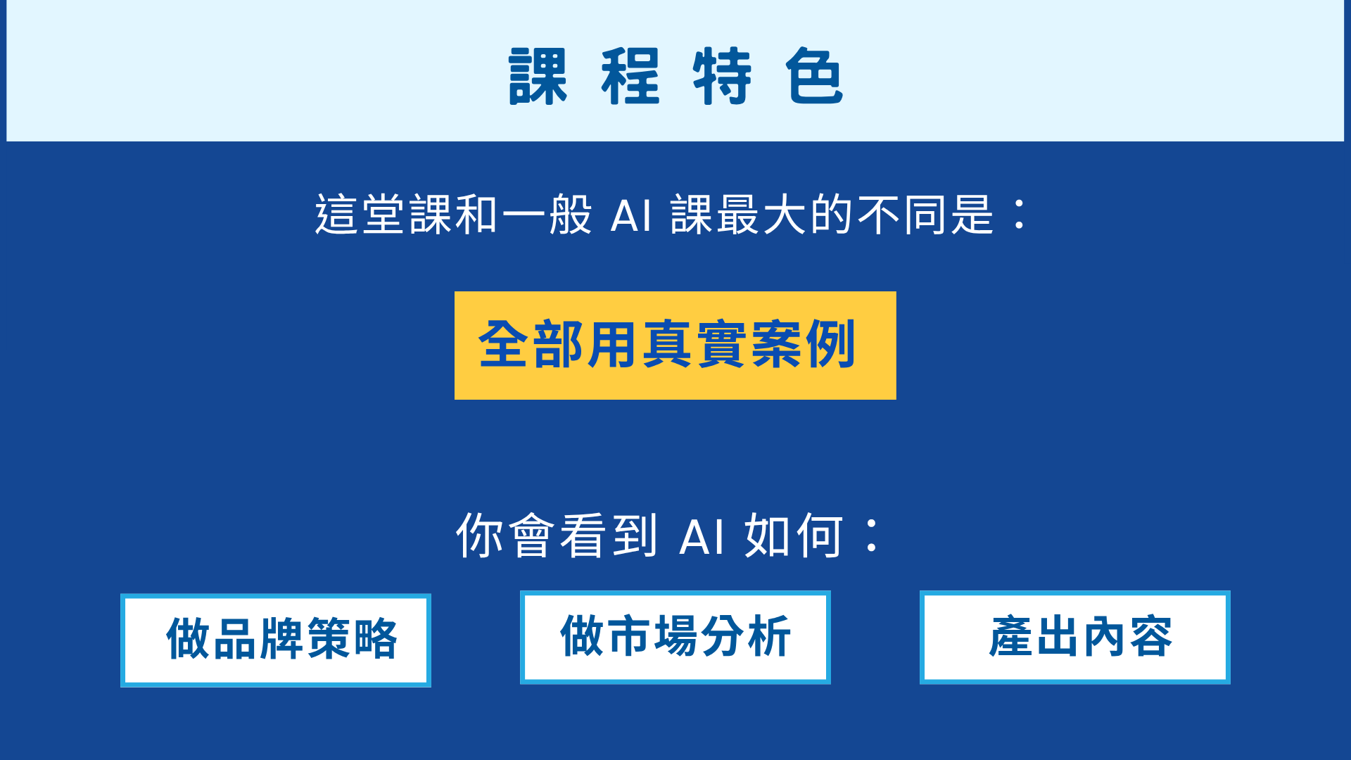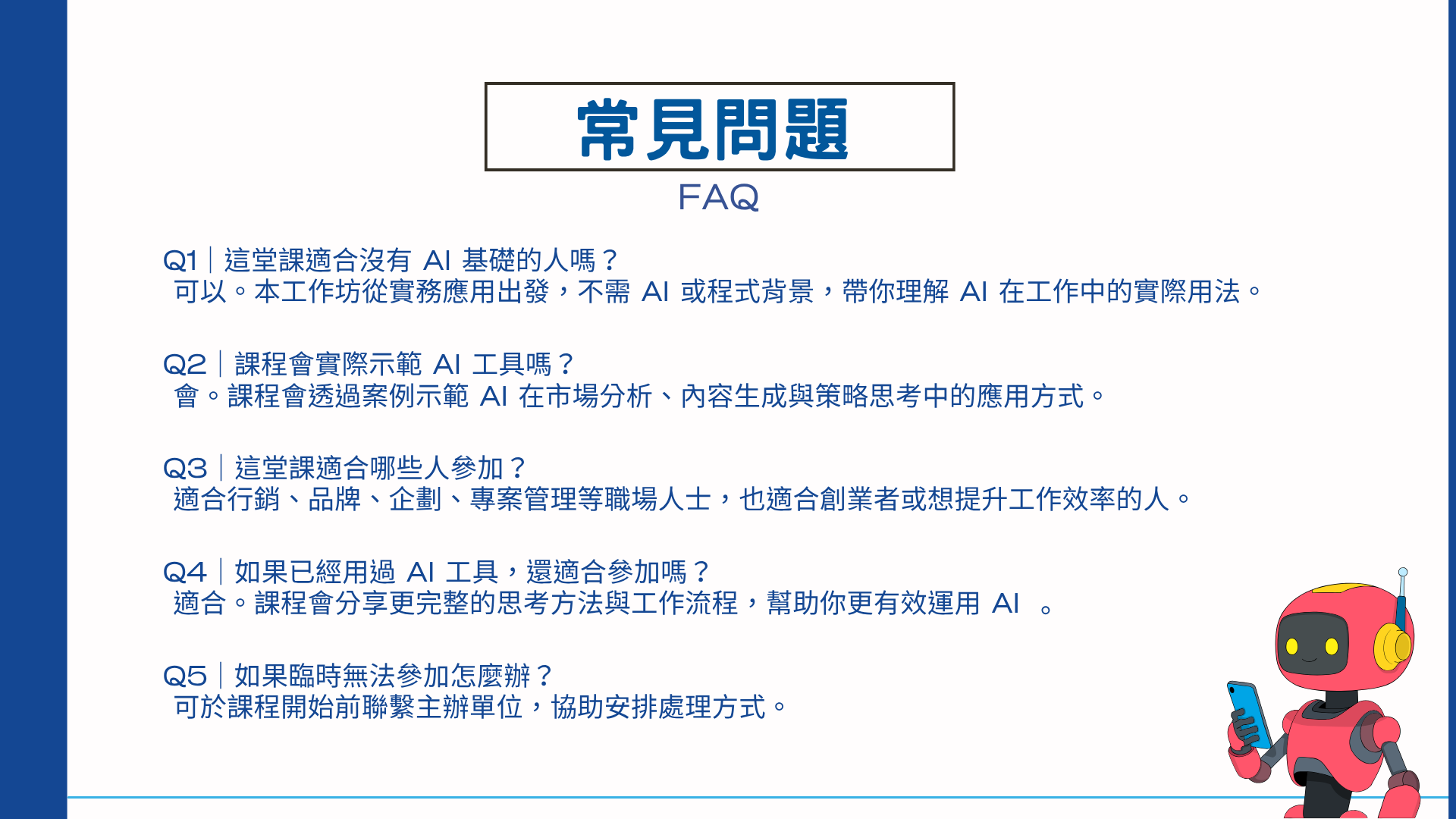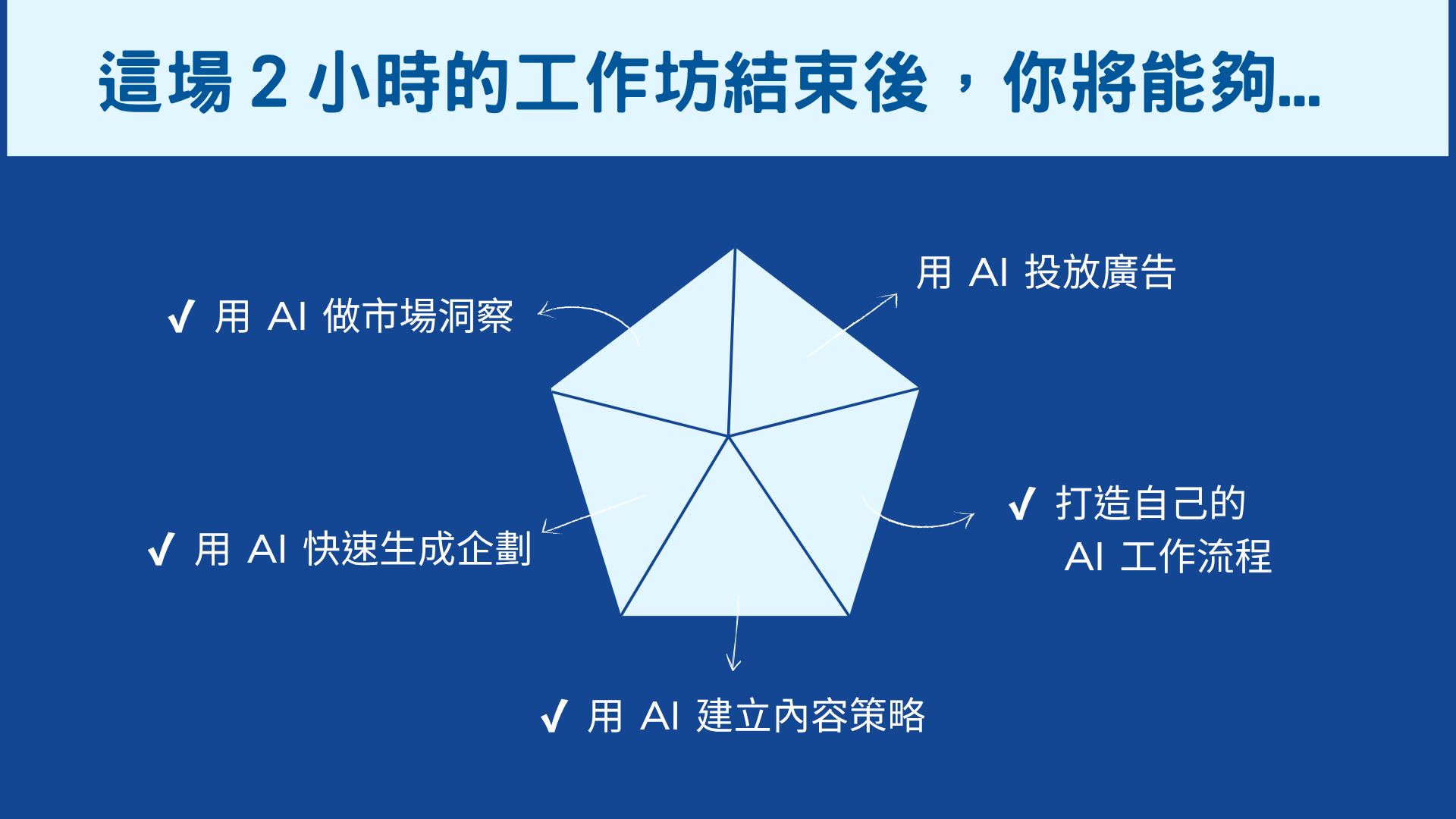 解決內容過剩帶來的信任貶值,建立 AI 時代的真實感。 用 AI 做洞察,讓創意不再靠直覺猜。 從執行型行銷升級為品牌策略主導者。 AI 介入後如何對你的工作內容重新定義,提升個人價值。 📍工作坊名額有限,欲報從速 !